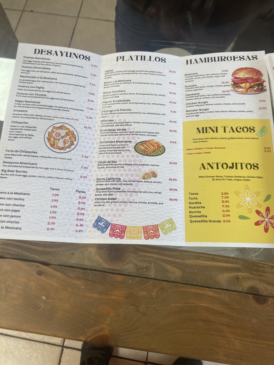 Omelette filled with cheese, tomato, onion, and meat of your choice. Accompanied by refried beans.